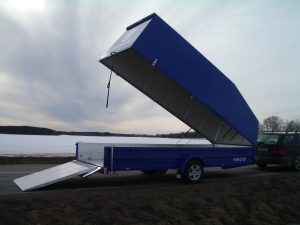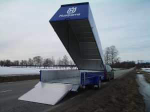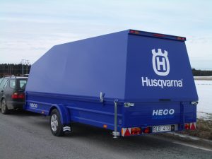 En specialbyggd släpvagn tillverkad åt Husqvarna AB. Husqvarna behövde en lasthöjd på 1,7m vilket löstes med förhöjda lämmar och en hög kåpa. För att kunna lasta maskinerna smidigt har vi monterat en förstärkt ramp på bakluckan vilken även har lyfthjälp för att motverka tunga lyft.